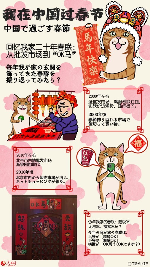 与此同时,春节装饰本身也发生了巨大的变化。贺卡的地位先是被手机短信取代,之后又被微信夺走了风头。而说到春联,随着网上英文春联成为热门话题,融入了网络用语和幽默风趣词句的春联也纷纷涌现。