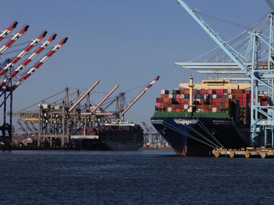 这是2025年5月10日在美国洛杉矶港拍摄的货船。新华社发(邱晨摄)
