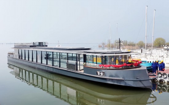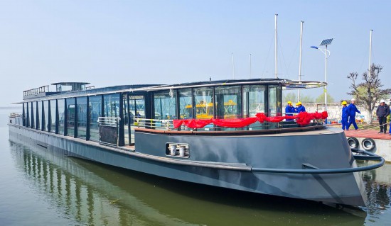 3月20日,由山东航宇游艇发展有限公司(以下简称“航宇游艇”)建造的法国塞纳河首艘40米纯电动餐饮游船“卡诺”号在微山湖顺利下水。