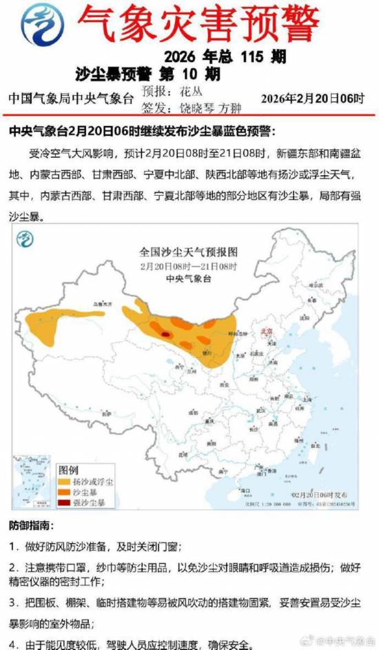 中央气象台2月20日06时继续发布沙尘暴蓝色预警。