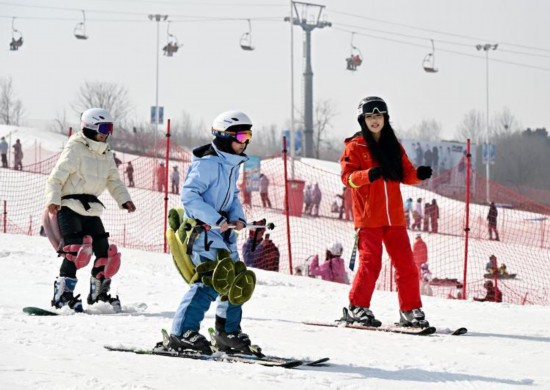 2月13日,游客在青岛西海岸新区融创藏马山滑雪场滑雪。新华社发
