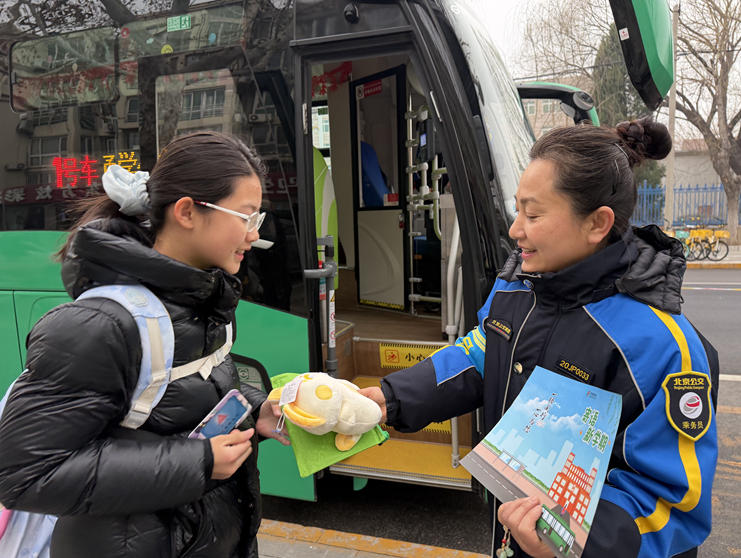 人民网北京3月2日电 (记者李博)3月2日是北京市中小学开学首日,清晨7点10分,通学300路公交车缓缓驶入站台,身穿蓝色制服的乘务员微笑着迎接陆续前到来的学生。
