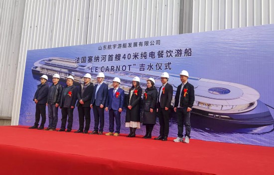 3月20日,由山东航宇游艇发展有限公司(以下简称“航宇游艇”)建造的法国塞纳河首艘40米纯电动餐饮游船“卡诺”号在微山湖顺利下水。