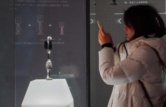 1月27日,在山东博物馆“对话蛋壳黑陶高柄杯”明星文物展上,一名参观者观看龙山文化蛋壳黑陶高柄杯。新华社发
