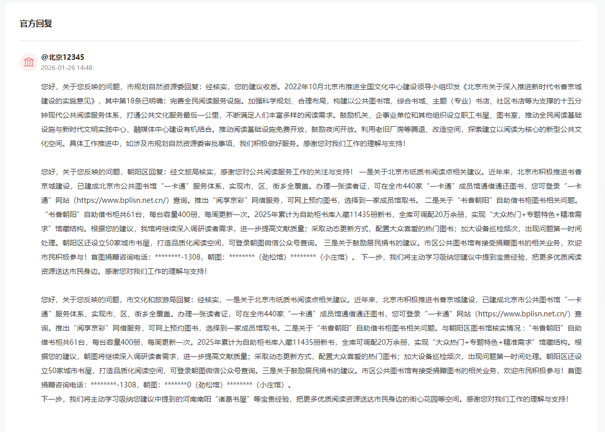 收到网友留言后,北京相关部门进行了回复。其中,北京市规划自然资源委表示,2022年10月北京市推进全国文化中心建设领导小组印发《北京市关于深入推进新时代书香京城建设的实施意见》,其中第18条已明确:完善全民阅读服务设施。加强科学规划、合理布局,构建以公共图书馆、综合书城、主题(专业)书店、社区书店等为支撑的十五分钟现代公共阅读服务体系,打通公共文化服务最后一公里,不断满足人们丰富多样的阅读需求。鼓励机关、企事业单位和其他组织设立职工书屋、图书室,推动全民阅读基础设施与新时代文明实践中心、融媒体中心建设有机结合。推动阅读基础设施免费开放,鼓励夜间开放。利用老旧厂房等腾退、改造空间,探索建立以阅读为核心的新型公共文化空间。目前具体工作正在积极推进中。